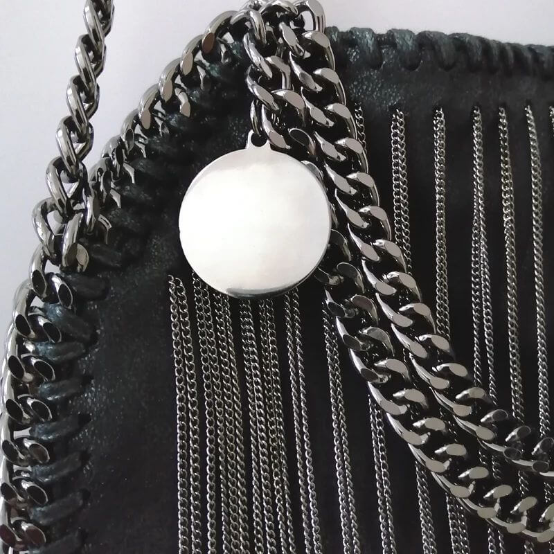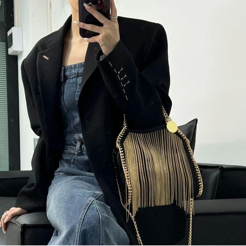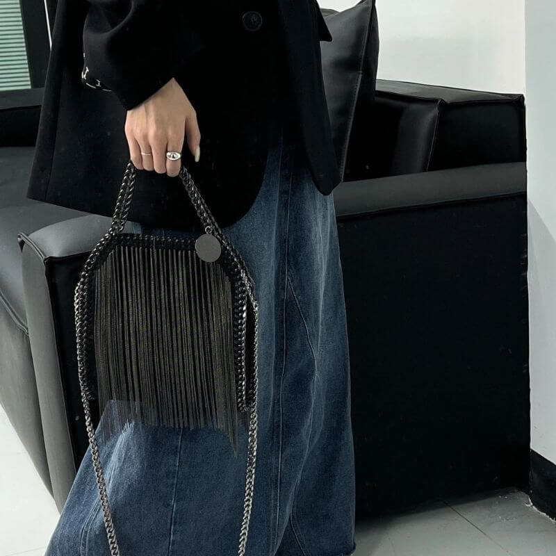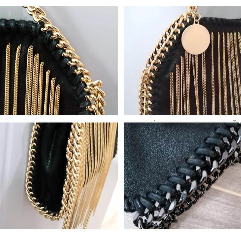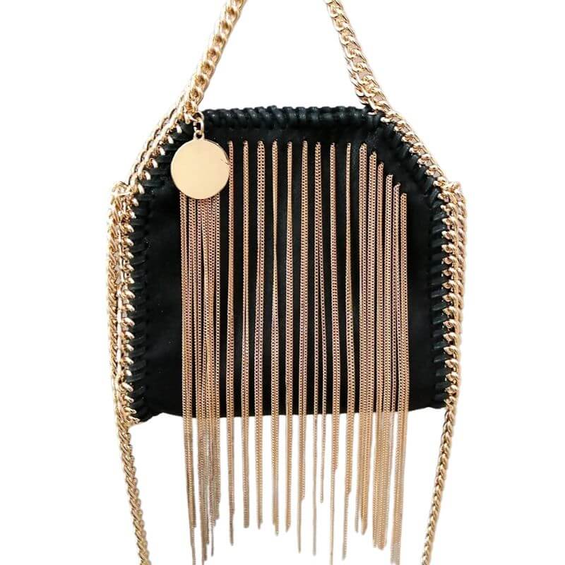 Ajoutez une touche glamour à votre tenue avec ce sac à main carré à franges en chaîne dorée et argentée.